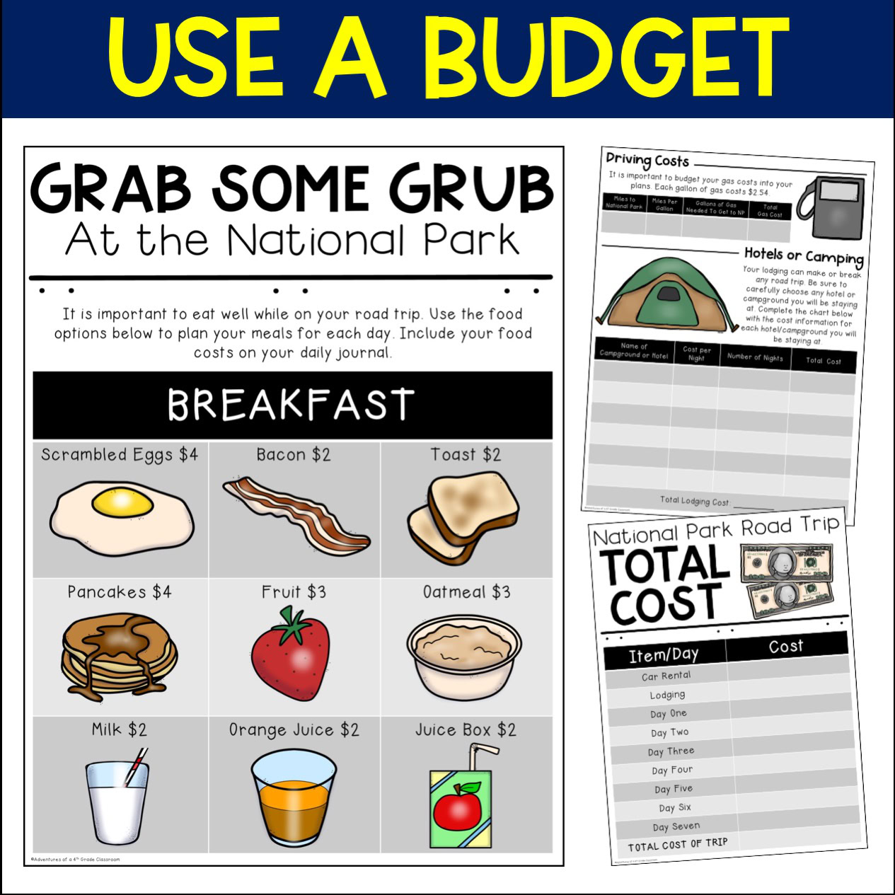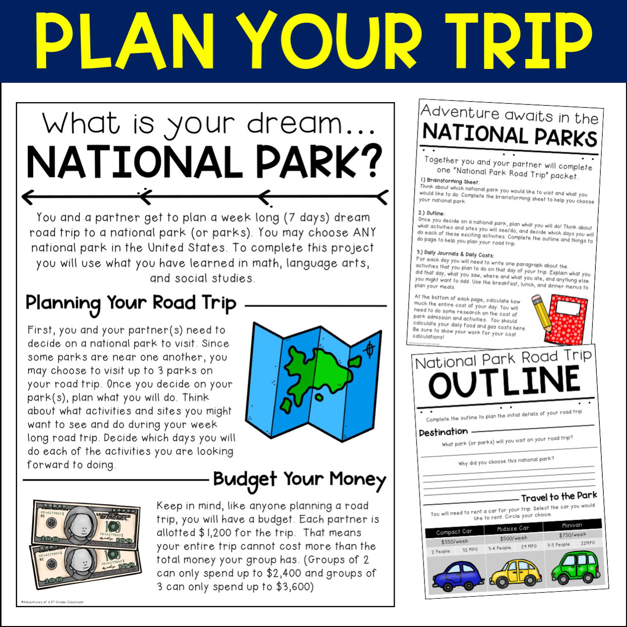 Planning a road trip to the national parks has never been so fun! In this cross-curricular project students will plan, budget, and journal about their national park road trip. They will pull skills from math, language arts, and social studies and work with their group members to complete the project.